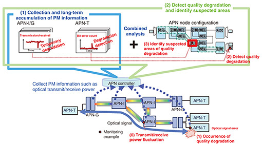 We have also developed optical-path flow-through establishment technology that automatically inputs the settings necessary to establish communication routes to the numerous devices that make up the APN (Fig. 3). By combining APN design technology and optical-path flow-through establishment technology, simply inputting the necessary information into the APN controller by an operator makes it possible to automatically calculate the optimal communication route and its communication quality from a huge number of combinations and constraints then input the settings into the devices that make up the APN to establish communication routes and provide communication services to end users. 4. APN-T multi-vendor-compatible control technologyThe APN uses a variety of equipment to provide users with overwhelmingly high-capacity and low-latency communications at low cost and to enable the flexible provision of a variety of services tailored to each user. In particular, an APN-T, which provides users with various interfaces (IFs) for APN services, makes it possible to use application-tailored models from a variety of equipment vendors, so that a variety of IFs can be provided to flexibly meet user needs. When these APN devices are operated, however, different models necessitate different configuration methods for opening optical paths and different methods for operating maintenance and operation functions; therefore, network operators must learn the methods for configuration and maintenance operation suited to each device model and use them in a way that suits each device. As the APN-device models that must be handled increase in number, the burden on network operators thus becomes greater. To solve the above issues, we have developed APN-T multi-vendor-compatible control technology that enables common control of various models of APN-Ts by using an open control interface. Specifically, by using Open Config, which is being developed as a common data model and application programming interface (API) specification for centrally managing network devices independent of vendors or protocols, we can provide common operations (e.g., opening optical paths and monitoring alarms) for different APN-T models. Many APN-T models use Open Config as the control interface, and using it enables them to be operated centrally in a way that significantly reduces the burden on network operators. By enabling the efficient operation of various APN-T models, we are able to provide flexible IFs tailored to each user of a particular APN service. 5. Proactive-maintenance technologyWhile the deployment of the APN is expected to reduce equipment costs by reducing the number of relay routers and transponders, the longer optical sections will make it more difficult to isolate and respond to service interruptions caused by degradation of optical-signal quality, and that difficulty could result in prolonged restoration work. To address this issue, we have developed proactive-maintenance technology as an advanced maintenance function for the APN controller. This technology uses information about the physical characteristics of optical signals, links that information to configuration information for analysis, and enables early detection of suspect areas of the APN (Fig. 4). Specifically, we are developing two major functions.