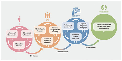 Front-line Researchers Vol. 24, No. 4, pp. 1–7, Apr. 2026. https://doi.org/10.53829/ntr202604fr1 Well-being Competency in Learning, Work, and Research SettingsAbstractThe importance of well-being, which places value on people’s existence and state of mind and cannot be measured solely by economic value, has been increasing. In an unpredictable era, characterized by rapid technological development and dramatic changes in social conditions, it is necessary for people to have the flexibility to think and act to adapt to diverse values and rapidly changing circumstances while working together to create and adjust paths as we move toward our goals. Junji Watanabe, a senior distinguished researcher at NTT Communication Science Laboratories is proposing and developing specific methods for acquiring and using well-being competencies in practical settings such as school education and corporate activities. We spoke with him about his recent areas of focus and his own research style. Keywords: well-being competency, education, employee engagement Developing competencies for living a life of well-being—Would you tell us about your recent activities related to research on well-being? In September 2025, we published a book titled “Well-being Competency—Ways of Thinking and Practical Methods for Incorporating Well-being into the Learning Environment” (by M. Taira, J. Watanabe, and M. Yokoyama; Toyokan Publishing). This book summarizes the content of our research to date, including specific practical methods, on how to foster “well-being competency” in school education, primarily for students in elementary and junior high schools, so that our research accomplishments can be directly useful to teachers in the field. One of the reasons for publication of this book is the explicit statement of “improving well-being rooted in Japanese society” in the Fourth Basic Plan for the Promotion of Education, approved by the Japanese Government Cabinet in June 2023. When well-being is authorized as part of education and positioned as a concept that everyone should understand as a common language for creating a future society, it’s easy to imagine that teachers might feel a certain amount of anxiety. Teachers are likely to be troubled by the prospect of updates to curriculum guidelines and other documents while they wonder how to teach well-being to students. We hope that our book will serve as a bridge between the concept of well-being and the practices of teachers. Teachers are busy, so if they think, “Here’s another unnecessary task...”, it would be counterproductive. First, we tell teachers that learning about well-being does not replace the learning they are currently supporting; rather, it adds new value. Let us take a brief look at well-being competency. “Competency” refers to practical qualities and abilities that are not limited to specific fields. It includes not only knowledge but also attitude toward society and problems as well as the ability to make decisions and act appropriately in specific situations. Well-being competency means “practical qualities and abilities needed for living a life of well-being” and requires each person to be able to find their own way of being in the various environments and situations of their daily lives. To develop well-being competency in the educational field, we proposed the Well-being Competency Model (Fig. 1). The model divides the scope of relationships that achieve well-being into four categories: “I”: myself, “We”: people close to me, “Society”: society including the public, and “Universe”: a larger entity. We have established a total of nine competencies—based on the three perspectives of cognition, emotion, and action—for the “I,” “We,” and “Society” categories and one competency for the “Universe” category, making a total of ten competencies that should be acquired as well-being competencies.