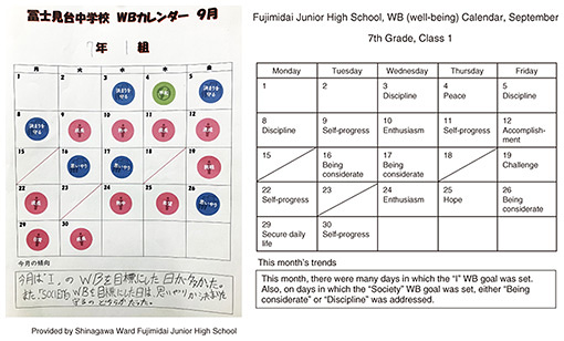 Acquiring “I” competencies related to self-understanding, self-acceptance, and self-regulation will enable self-disclosure with those close to you; acquiring “We” competencies will enable collaboration with those close to you; and acquiring “Society” competencies is expected to enable active participation in society. It is thus necessary to acquire competencies from the four categories; however, naturally, they don’t have to be acquired in a particular order, and the competencies in each category influence each other. The Well-being Competency Model is used in schools to put well-being competencies into practice, and our book broadly categorizes these practices into “targeted” and “arranged” types. The targeted type refers to educational activities with the primary purpose of acquiring and improving well-being competencies and are likely to be highly compatible with subjects such as “The period for integrated studies (inquiry-based learning),” “special subject on moral education,” and “classroom activities.” In contrast, the arranged type refers to educational activities with the primary goal of learning existing subject content (such as Japanese language or social studies) in which well-being concept is incorporated as a secondary component. In education, the annual class hours for each subject are set by curriculum guidelines, so it is difficult to incorporate well-being lessons into those hours. However, arranged practices based on existing educational activities are a means of effortlessly incorporating well-being into everyday lessons and activities. For example, in Japanese-language classes, simply changing the statement “Put yourself in the protagonist’s shoes” to “Consider what well-being the protagonist valued and acted on accordingly” can set tasks related to the “I” competency. In home-economics classes, a task such as “Let’s cook a meal while considering the well-being of our family” could be linked to learning related to the “We” competency. In social-studies classes, asking “What can I do to help people in depopulated areas live to achieve well-being?” could be expanded to address the “Society” competency. Another example of an arranged practice can be seen in classroom activities. During morning assembly, students introduce the “well-being that the class wants to prioritize today.” This well-being priority is then recorded daily and color-coded into the aforementioned four categories. This process creates a monthly calendar that makes it possible to visualize the things the class wants to prioritize and understand daily changes due to events (Fig. 2). This practice has enabled students to develop the habit of thinking about not only themselves but also the whole class by applying the reflections from the previous day’s class to their own actions on the present day.