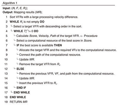 2. Resource allocation methodOur resource allocation method is a polynomial-time heuristic approach that integrates the impact of the characteristics of heterogeneous computational resources and that of parallel processing. The first impact is modeled by scoring VF parameters that adapt depending on the computational resources used, while the second impact is modeled by determining the appropriate parallelism through a comparison of the throughput requirement of the service and allocatable processing velocity of VFs with the calculated delay requirement. 2.1 ModelThe disaggregated computing system is represented with an undirected graph G(N,E), where N ∋ n and E ∋ (n, n') denote sets of nodes and links, respectively. There are two types of nodes: computational resources and switches. The notation NC ∋ c denotes the set of computational resources and NP ∋ p denotes the set of switches (N = NC ∪ NP). A computational resource refers to an XPU (CPU, GPU, FPGA, and other accelerators) on which VFs are implemented, and a switch refers to two types of a device that connects resources within a network: internal (Peripheral Component Interconnect Express (PCIe)) and external (Ethernet) switches. The notation F ∋ ƒ denotes a set of VFs that execute VFRs with computational resources. Several parameters of a VF will vary depending on the computational resources on which it is implemented. The notation S ∋ s denotes a set of services composed of an ordered chain of VFRs. The performance requirements of the services are defined by throughput requirements 2.2 Heuristic approachResource allocation problems are generally NP (nondeterministic polynomial time)-hard, which indicates that finding an optimal solution within a reasonable timeframe is computationally challenging since it is transformed into the capacitated facility location problem, which is known to be NP-hard [17]. To address this issue, we developed a polynomial-time heuristic approach. Our heuristic approach is greedy in that it simultaneously determines the allocation and routing for each VFR. This heuristic approach explores potential solutions by executing provisional allocation and routing in advance and then determines the allocation and routing of the near-optimal solution by scoring to account for the impact of the characteristics of heterogeneous computational resources. By proactively exploring solutions that satisfy constraints, this approach significantly reduces the solution space, enabling the time-efficient allocation of VFRs. It also facilitates the appropriate determination of parallelism by comparing the throughput requirement of the service and the allocatable processing velocity of VFs with the delay requirement calculated during the provisional placement and connection phases. Algorithm 1 shows the processing of this heuristic approach. First, it sorts the VFRs of the service. A VFR having a large processing-velocity difference is placed at the top, and VFRs with smaller indices than this initial VFR are then sorted in descending order. Next, VFRs with larger indices than the initial VFR are sorted in ascending order, and a target VFR is selected from the top of the resulting list. Procedure 1 calculates the Score, Velocity, and Path for the target VFR while the remaining throughput requirement