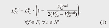 When the above conditions are met and the target VFR is not the first VFR of the service, the shortest path (c, c') is determined using the Dijkstra method. When the previous VFR is divided, since there are several start/end points, the shortest path is calculated by all start/end points. If there is no shortest path in the allowable bandwidth, the target VFR cannot be allocated to the computational resource. If there is a shortest path, we determine the maximum allocatable processing velocity (Vmax) of the target VFR that guarantees the delay requirement of the service. The execution time of a service can be described as the sum of the maximum transmission delay of a path and the maximum processing delay of a VF. We use the M/D/1 queueing model*6 to capture the change in the processing delay with the utilization of the VF. Equation 1 shows the processing delay