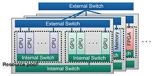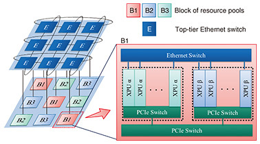 Regular Articles Vol. 24, No. 4, pp. 53–63, Apr. 2026. https://doi.org/10.53829/ntr202604ra1 Resource Allocation with Heterogeneous Resources and Parallelism in Disaggregated ComputingAbstractDisaggregated computing improves resource utilization by pooling central processing units, memory, and accelerators and flexibly assigning heterogeneous resources to each service component. To maximize these benefits, resource allocation and routing must be decided efficiently before execution. This article introduces a practical-time resource allocation method that models heterogeneous resource characteristics and parallel processing effects. Simulations in heterogeneous disaggregated systems show that this method meets service-performance requirements while reducing required resources by 28–51% on average compared with conventional methods. Keywords: disaggregated computing, resource allocation, hardware acceleration 1. IntroductionThe pace of performance improvement in general-purpose central processing units (CPUs) has slowed in the post-Moore’s-law era, while the demand for computation has been increasing rapidly due to the spread of artificial intelligence (AI). To sustain performance growth with this gap, modern systems increasingly rely on specialized accelerators—most notably graphics processing units (GPUs) and field-programmable gate arrays (FPGAs)—that can execute particular workloads more efficiently than CPUs. At the same time, AI models continue to scale in size and complexity [1], and many practical deployments require multiple accelerators to satisfy throughput and latency targets. This creates a strong need for system architectures that can combine heterogeneous computational resources and use them efficiently. To support heterogeneous and accelerator-centric workloads, datacenter operators have been increasingly interested in disaggregated computing*1, where CPUs, memory, and accelerators are pooled and flexibly composed through high-performance interconnects [2–5]. NTT’s Innovative Optical Wireless Network (IOWN)*2 initiative introduces Data-Centric Infrastructure (DCI)*3 as a future direction for such architectures [2, 3]. In this article, we specifically focus on resource allocation in disaggregated computing systems, which serves as a key technical foundation that can contribute to the actualization of DCI. Figure 1 shows the disaggregated-computing system model considered in this article; heterogeneous resources are grouped into resource pools and interconnected via internal and external transmission paths [2–4]. Resource pools contain resources of the same type (e.g., CPUs, GPUs, FPGAs), and the resources in each pool are connected through these transmission paths. Resource pools that are physically close to each other are connected via internal transmission paths, whereas those that are physically far from each other are connected via external transmission paths. We call a cluster of resource pools connected via internal transmission paths a block. This hierarchical organization reflects realistic datacenter deployments and is important because link characteristics (bandwidth, latency, and contention) differ between internal and external paths, directly affecting end-to-end service performance.