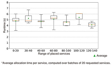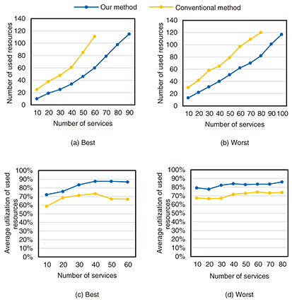 4.1 Random systemFigures 3(a), (b) show the results for the number of used resources and Figures 3(c), (d) illustrate resource utilization for best and worst cases, respectively. To evaluate the impact of the characteristics of heterogeneous computational resources without considering the impact of parallel processing, we also evaluated our method without parallel processing. Compared with the conventional method, our method decreased the number of resources by an average of 20 to 46% and increased the average resource utilization by an average of 16 to 20%. The difference arises from whether the characteristics of heterogeneous computational resources are accounted for. The conventional method without parallel processing struggles to allocate suitable resources, leading to lower performance and the need for additional resources. In contrast, our method effectively matches resources to VFRs, reducing the number of resources. It also improves resource utilization by accounting for the provisional utilization of resources on the basis of the impact of the characteristics of heterogeneous computational resources. Compared with the conventional method, our method with parallel processing decreased the number of resources by an average of 28 to 51% and increased the average resource utilization by an average of 29 to 35%. These results indicate that our method can further increase resource utilization and decrease the number of resources with parallel processing. The above findings clarify the importance of accounting for the characteristics of heterogeneous resources and parallel processing to maximize resource efficiency and utilization. 4.2 Realistic systemFigures 4(a), (b) show the results for the number of used resources and Figures 4(c), (d) illustrate resource utilization for best and worst cases, respectively. We evaluated the effectiveness of our method in practical cases. Compared with the conventional method, our method decreased the number of resources by an average of 41 to 49% and increased the average resource utilization by an average of 16 to 22%. These results indicate that our method will be beneficial in real-world environments. 4.3 RuntimeFigure 5 shows the distribution of the average allocation times for the 20 services in the random system, grouped by the number of services placed in the system. For each group, the box plot represents the variability of allocation time across different parameter settings, while the triangle marker indicates the average allocation time for each case. The results indicate that our method can allocate resources in all cases within ten seconds per service on average, which is considered acceptable for resource allocation before service execution. Although some variation in allocation time can be observed across different service groups, no clear increasing trend is observed as the number of placed services increases. This indicates that system usage has no effect on resource allocation time, even when the overall utilization of the system is high. These findings suggest that our method executes stable resource allocation regardless of system usage.