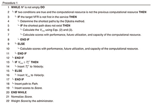 This score enables the allocation to maximize the future utilization rate of the computational resource. Since the future utilization rate also reflects the transmission delay included in the allowable processing delay, this score also has the effect of suppressing this transmission delay. The capacity score is 1 when the computational resource is in use and 0 when it is not. This score also adds 1 when the VFs needed to execute the target VFR are in use and 0 when they are not. Note that the administrator can add other scores. When the target VFR is the first VFR of the service, Vmax and the scores are calculated in the same manner as above with When Vmax is Algorithm 1 selects the computational resource of the best score in Score. When the score is available, which means there is a computational resource where a VFR can be placed, the target VFR is allocated to the computational resource. If there is no VF available to execute the target VFR in the computational resource, the VF is also allocated to the computational resource. The path of the computational resource in Path is also connected, and the processing velocity of the computational resource and