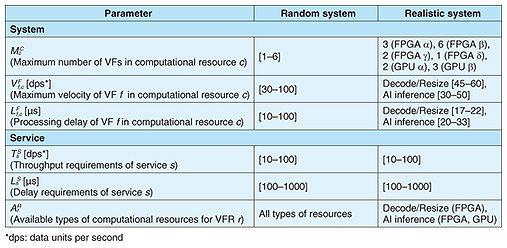 3. Experimental setupWe compared our method with the conventional method based on Holu [13] across various disaggregated computing systems. We first evaluated a heterogeneous system with random parameters to analyze the impact of heterogeneous computational resource characteristics and parallel processing. We then assessed the practicality of our method in a realistic heterogeneous system resembling real-world scenarios. Finally, we measured the resource allocation time to confirm whether the method produces solutions within a practical timeframe. 3.1 Simulation setupWe coded both our method and the conventional one in Python 3.10 and conducted simulations on an Intel-based personal computer with Intel Core i9-14900K 3.20 GHz (128-GB random access memory). 3.1.1 SystemWe assume the disaggregated computing system shown in Fig. 2: a 3 × 3 mesh topology with 144 computational resources, which is both commonly used and scalable [18]. The system consists of resource pools (8 resources each) connected via internal PCIe links and system-wide Ethernet, with top-tier switches for external network access. Six types of computational resources with distinct characteristics are symmetrically arranged. In the random system, we randomly set parameters of computational resources and VFs within the range shown in Table 1 (left). In the realistic system, based on experimental information [19] and typical real-world device information [20–25], we set the parameters shown in Table 1 (right). In the realistic system, we assume B1 consists of two GPU types [20, 21] B2 and B3, each consisting of two FPGA types [22–25], as shown in Fig. 2.